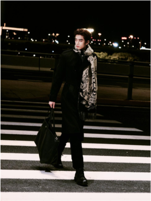 Đại sứ thương hiệu Chen Kun mặc áo khoác Harrington bằng len, áo thun Knight Stamp, quần corduroy đen phối cùng boots da Chelsea, khăn cashmere hai mặt, balo Orkney màu đen và mũ lưỡi trai gabardine màu đen.