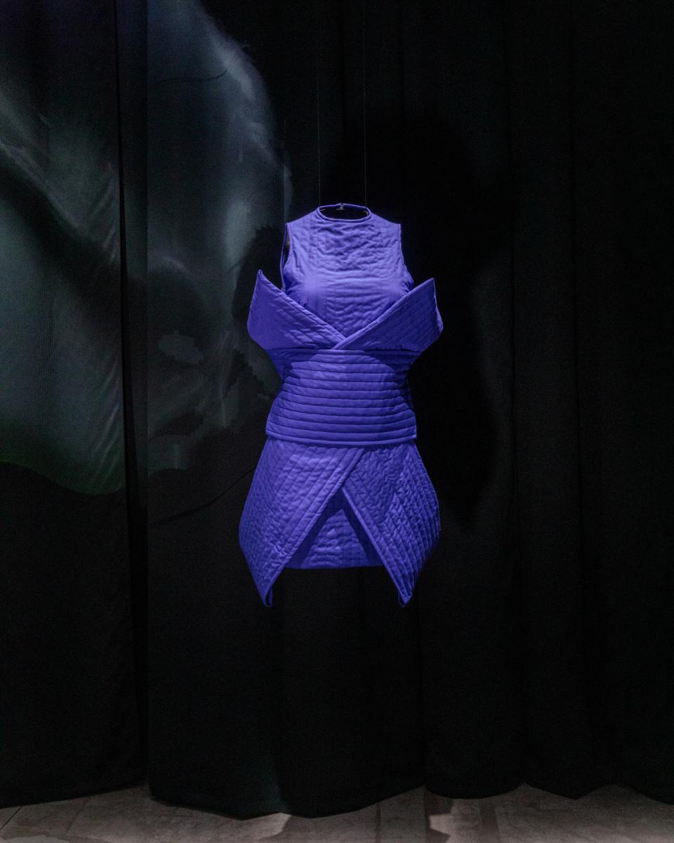 Sự cân bằng và chuẩn xác tiếp tục được thể hiện trong bộ trang phục Zen gồm gile, sơ mi trắng và quần phồng xếp ly – nơi phong thái điềm tĩnh gặp gỡ sự tinh tế chiến lược. Những chiếc bomber chần bông được nhấn bằng cầu vai vững chãi và vòng eo ôm gọn, trong khi áo khoác boxy trắng lại được khâu ghép từ những đai judo, mang đến hiệu ứng vừa lạ mắt vừa giàu tính biểu tượng. Khép lại màn trình diễn là blazer hai hàng khuy sắc sảo, buộc bằng nút kiểu võ thuật và phối cùng quần ống rộng, tái hiện khí chất uy nghiêm của những bậc thầy võ đạo.