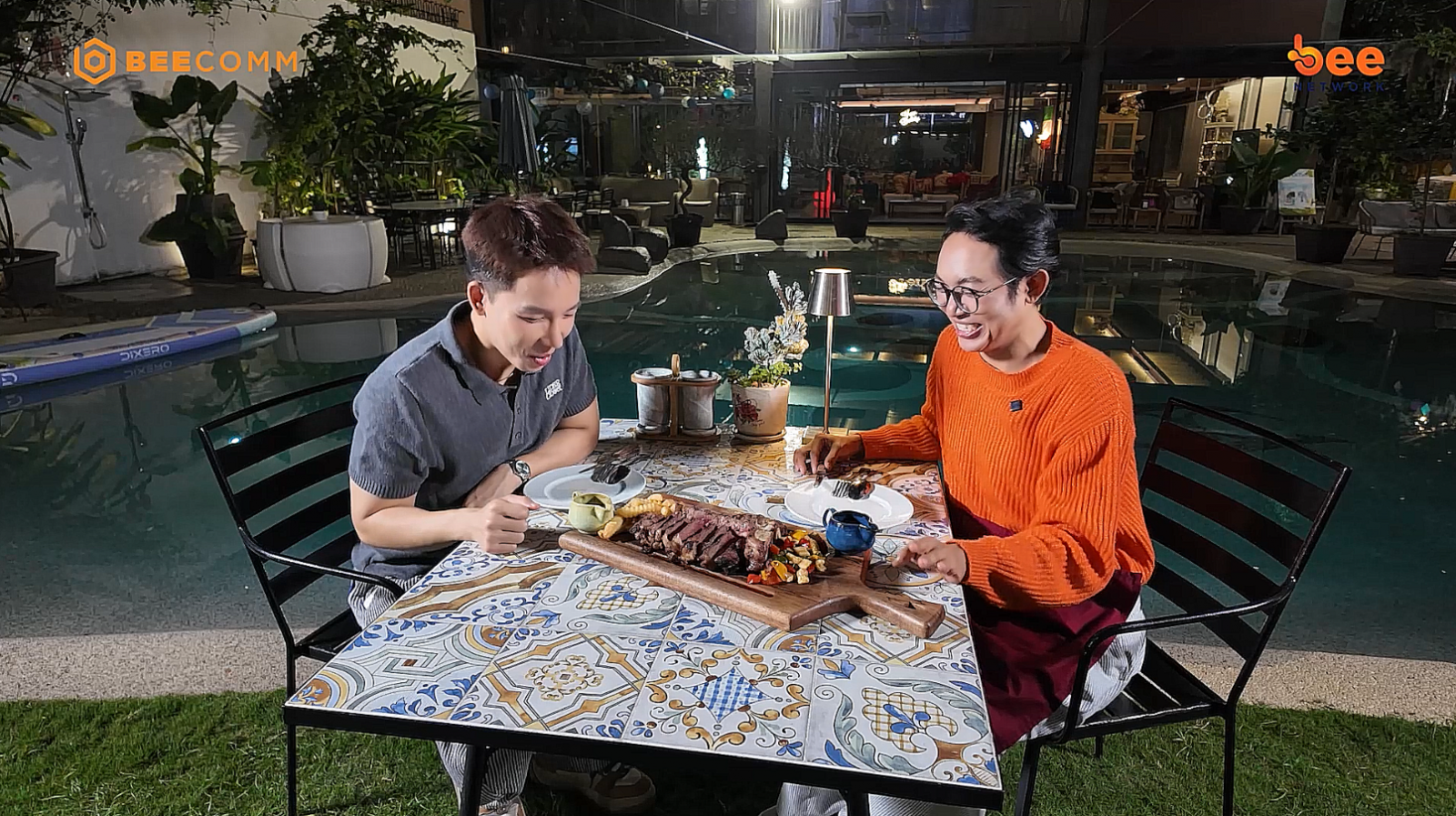 Khép lại bữa tiệc là món thịt bò T-bone nướng than đầy hấp dẫn. Ngay khi được phục vụ, Kan Hy không khỏi bất ngờ trước khẩu phần “khủng” với phần xương chữ T đặc trưng, miếng thịt dày, nướng trên than hồng tỏa hương thơm lừng, quyến rũ. Lớp ngoài xém nhẹ bắt mắt, bên trong vẫn giữ được độ mềm mọng, tạo cảm giác vừa nhìn đã muốn thưởng thức ngay.
