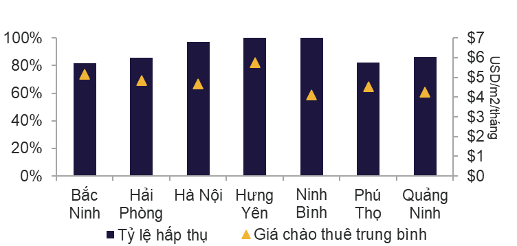 Động lực chính thúc đẩy nguồn cầu trong quý vẫn tập trung vào các ngành công nghệ cao, sản xuất linh kiện điện tử và bo mạch, tiêu biểu là các dự án đầu tư quy mô lớn vào thủ phủ công nghiệp Bắc Ninh. Xét theo từng địa phương, Hà Nội tiếp tục duy trì trạng thái lấp đầy tuyệt đối 100% do khan hiếm quỹ đất, trong khi Bắc Ninh giữ vững sức hút với tỷ lệ lấp đầy đạt 74,1%. Các khu vực mới gia nhập sau sáp nhập như Quảng Ninh (49,27%) và Phú Thọ (52,87%) hiện có tỷ lệ lấp đầy ở mức trung bình, tạo ra dư địa lớn để thu hút các nhà đầu tư đang tìm kiếm diện tích thuê lớn với chi phí tối ưu.