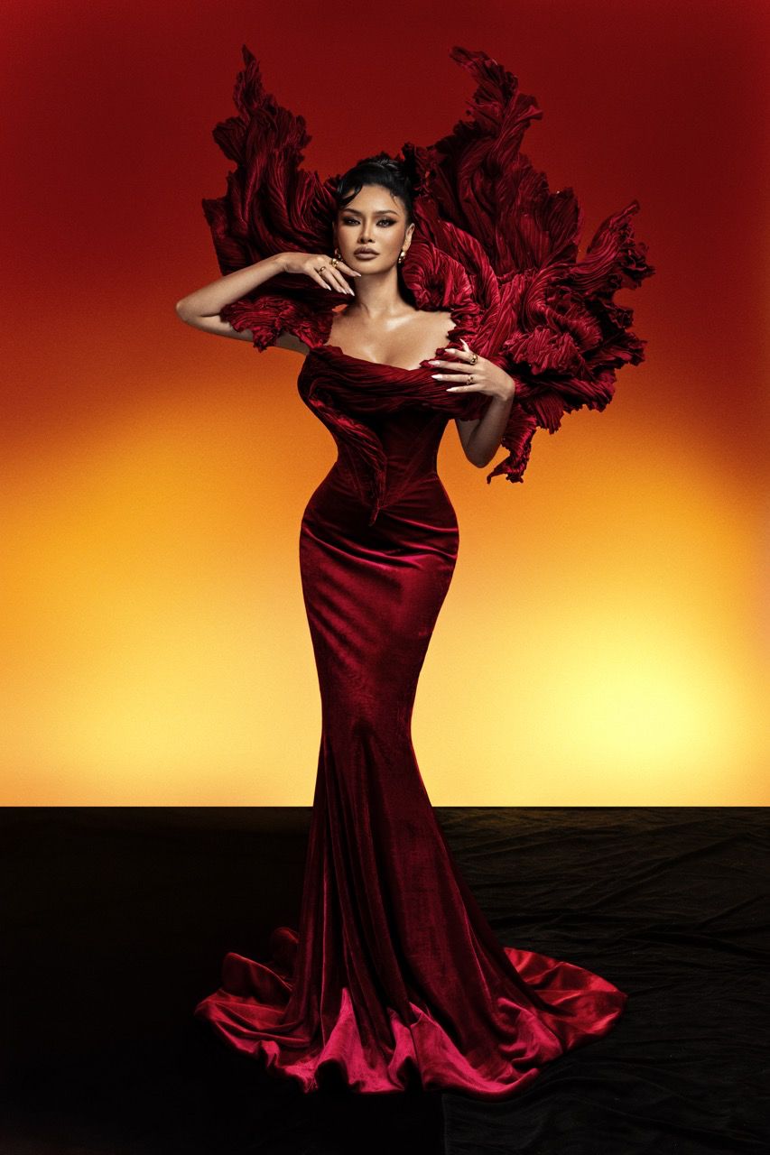 Song hành cùng đương kim Hoa hậu, Á hậu Mook Karnruethai Tassabut gây ấn tượng với thiết kế “Vương Miện Lửa”, biểu trưng cho quyền lực và sức hấp dẫn nội tại. Chiếc đầm nhung đỏ được tạo khối mềm mại, với những nếp gấp tựa sóng lửa ôm lấy cơ thể, toát lên vẻ cuốn hút. Thiết kế là sự giao hòa giữa hiện thực và nghệ thuật, tôn vinh hình ảnh người phụ nữ tự tin và kiên định, luôn tỏa sáng trên hành trình khẳng định chính mình.