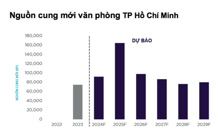 Năm 2025, thị trường văn phòng TP.HCM ghi nhận thêm 165.000 m² nguồn cung mới từ hai dự án ở cả khu vực trung tâm và ngoài trung tâm. Tỷ lệ hấp thụ thuần văn phòng hạng A trên toàn thành phố dự báo sẽ duy trì sự ổn định trong năm tới. Từ năm 2024 đến 2029, giá thuê trung bình tại TP.HCM dự báo sẽ duy trì ổn định, với mức thay đổi dưới 1% mỗi năm, ngoại trừ năm 2025 có dự báo tăng cao hơn.