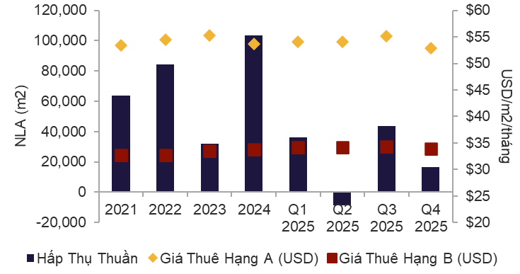 Hạng B ghi nhận 16.472 m2 hấp thụ thuần, giảm -15,9% QoQ và -25,8% YoY, nhưng chiếm gần như toàn bộ lượng hấp thụ của thị trường trong quý. Điều này cho thấy Hạng B - đặc biệt tại Non-CBD - tiếp tục là động lực cầu chính, hưởng lợi từ xu hướng tối ưu chi phí và dịch chuyển ra ngoài trung tâm, đồng thời phản ánh tính bền vững hơn của phân khúc này trong giai đoạn thị trường điều chỉnh.