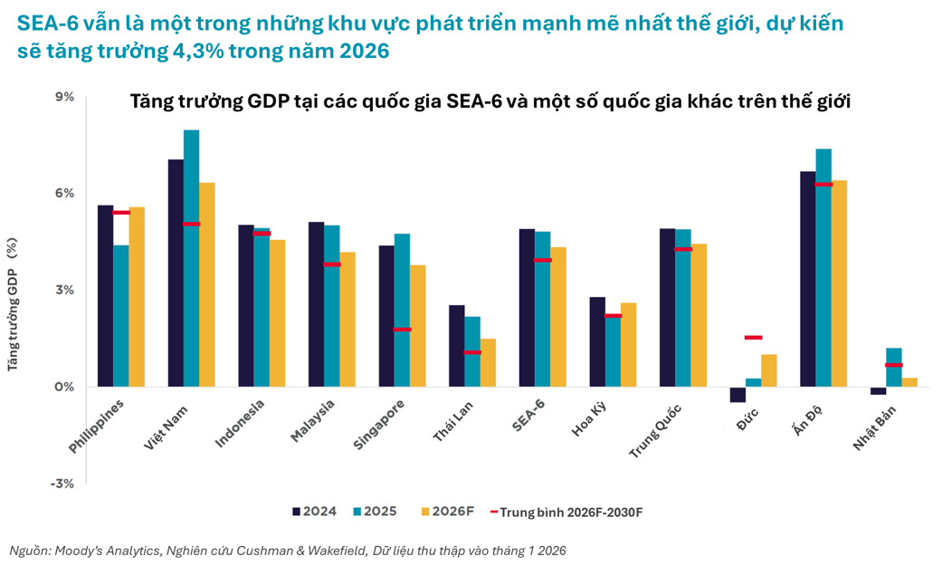 Trong thời gian tới, đà tăng trưởng kinh tế được dự báo sẽ điều chỉnh nhẹ. Tốc độ tăng dân số đã chậm lại còn 0,6%, trong khi lãi suất cho vay tại các ngân hàng thương mại có xu hướng tăng vào cuối năm, có thể tạo áp lực nhất định lên nhu cầu nhà ở và chi tiêu tiêu dùng trong ngắn hạn. Tuy nhiên, nền kinh tế Việt Nam vẫn được dự báo tăng trưởng 6,3% trong năm 2026, tiếp tục duy trì vị thế là một trong những nền kinh tế tăng trưởng nhanh nhất trong nhóm SEA-6.