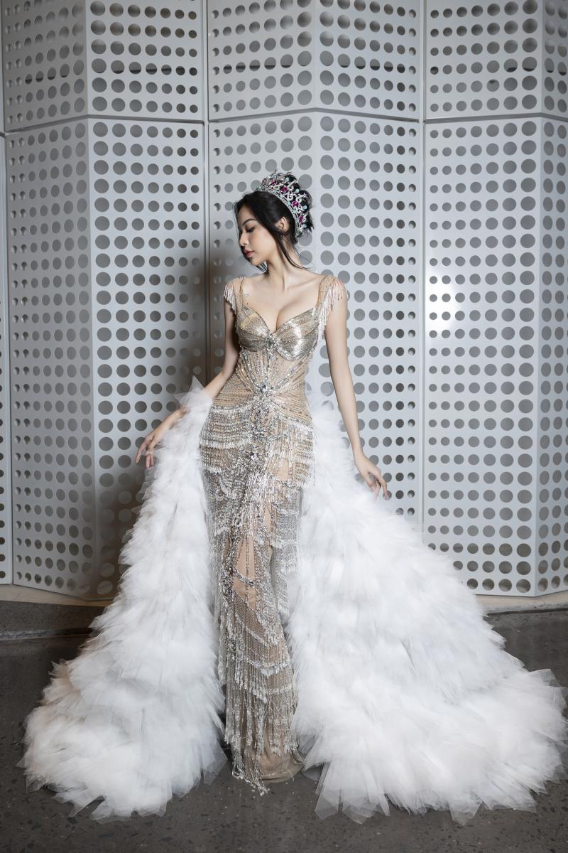 Được biết, chiếc váy mà Phí Phương Anh mặc từng được Isabella Menin - Miss Grand International 2022 lựa chọn mặc trong phần final walk để kết thúc nhiệm kỳ hoa hậu của mình. Bộ đầm được thực hiện tỉ mỉ với hơn 5.000 viên đá lấp lánh đính kết trên bề mặt thân váy với chất liệu xuyên thấu, kết hợp đuôi váy làm từ 200 mét vải tulle nặng hơn 10 kg. Những sợi tua rua trên váy giúp những bước chân của Phí Phương Anh thêm phần uyển chuyển.