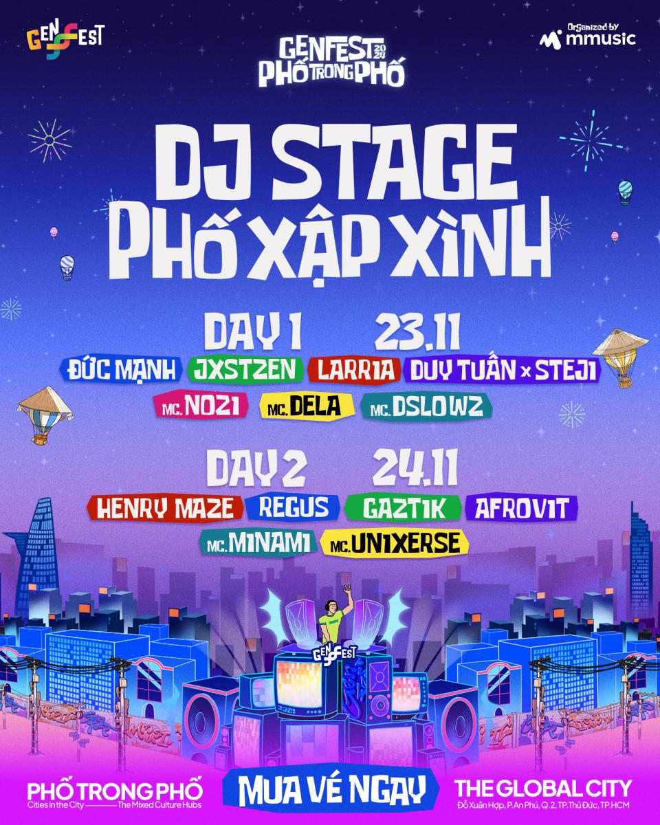 Bên cạnh sân khấu chính tại khu vực Phố Trung Tâm, GENfest 2024 còn chuẩn bị hẳn một DJ Stage mang tên MStage tại khu vực Phố Xập Xình, quy tụ 13 DJ và MC Hype tham gia trình diễn. Với các dòng nhạc chủ đạo như EDM, House, Hip-hop, Bass Music, đây hứa hẹn là nơi mang đến bầu không khí sôi động, hiện đại và thu hút đông đảo các bạn trẻ. Trong ngày đầu tiên tổ chức - 23/11, sân khấu MSTAGE sẽ có DJ JXSTZEN, Đức Mạnh, LARRIA, Duy Tuấn & STEJI cùng 3 MC Hype NOZI, DELA, DSLOWZ. Tới ngày thứ hai tổ chức - 24/11, sân khấu MSTAGE sẽ có DJ GAZTIK, HENRY MAZE, AFROVIT, REGUS, cùng MC Hype MINAMI, UNIXERSE.