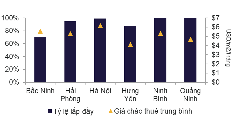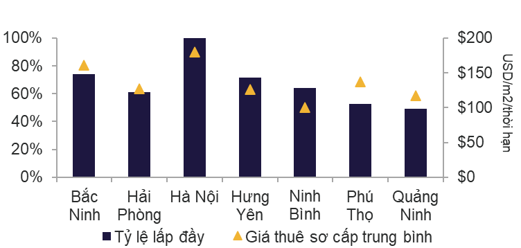 Động lực chính thúc đẩy nguồn cầu trong quý vẫn tập trung vào các ngành công nghệ cao, sản xuất linh kiện điện tử và bo mạch, tiêu biểu là các dự án đầu tư quy mô lớn vào thủ phủ công nghiệp Bắc Ninh. Xét theo từng địa phương, Hà Nội tiếp tục duy trì trạng thái lấp đầy tuyệt đối 100% do khan hiếm quỹ đất, trong khi Bắc Ninh giữ vững sức hút với tỷ lệ lấp đầy đạt 74,1%. Các khu vực mới gia nhập sau sáp nhập như Quảng Ninh (49,27%) và Phú Thọ (52,87%) hiện có tỷ lệ lấp đầy ở mức trung bình, tạo ra dư địa lớn để thu hút các nhà đầu tư đang tìm kiếm diện tích thuê lớn với chi phí tối ưu.