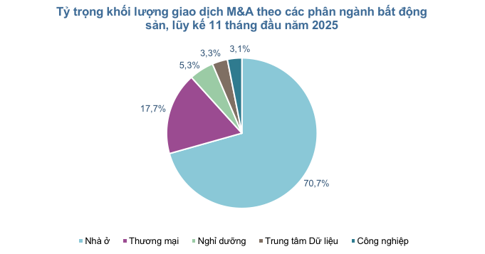 Theo quan sát của JLL đối với các thương vụ M&A có thông tin được công bố trong 11 tháng đầu năm 2025, tổng khối lượng giao dịch lũy kế đạt khoảng 2,4 tỷ USD. Tuy nhiên, nếu bao gồm cả các giao dịch chưa được công bố chính thức mà JLL quan sát và thống kê được, thì khối lượng giao dịch ước tính cao hơn rất nhiều. Đáng chú ý, lĩnh vực bất động sản nhà ở dẫn đầu khi chiếm tỷ trọng hơn 70% tổng khối lượng giao dịch M&A. Các phân khúc khác như bất động sản thương mại và nghỉ dưỡng lần lượt chiếm tỷ trọng khoảng 17,7% và 5,3%. Lĩnh vực Trung tâm dữ liệu cũng nổi lên như một trong những thị trường ngách tiềm năng, chiếm tỷ trọng giao dịch M&A ở mức 3,3%.