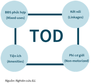 Dựa trên các quan sát thị trường từ góc độ bất động sản, các chuyên gia JLL nhấn mạnh rằng các dự án TOD thành công cần được xây dựng trên bốn trụ cột cơ bản: kết nối, giao thông phi cơ giới, tiện ích, và phát triển bất động sản phức hợp. Mỗi trụ cột này đóng vai trò quan trọng và bổ trợ lẫn nhau trong việc tạo ra một hệ sinh thái TOD hoàn chỉnh và bền vững.