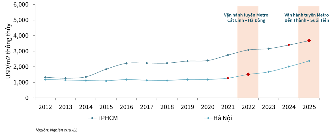 Các dự án bất động sản liền kề ga metro ghi nhận tốc độ tăng giá đáng kể sau khi các tuyến metro chính thức đi vào hoạt động.