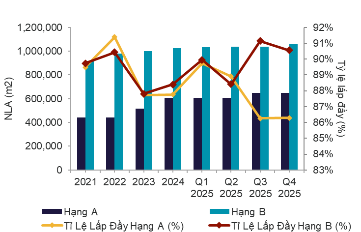 Q4 2025 ghi nhận khoảng 25.554 m2 nguồn cung mới, giảm 41,2% so với Q3 2025, tổng nguồn cung đạt xấp xỉ 1.713.680 m2 (+1,51% QoQ; +4,83% YoY). Hạng B tiếp tục chiếm ưu thế về quy mô (~1.060.369 m2), trong khi Hạng A (~650.851 m2) tập trung bổ sung các dự án chất lượng cao tại vị trí chiến lược.